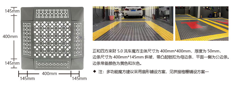 1. 分為3.4.5.厚度,解決不同厚度,統(tǒng)一紋路的問題 2. 啞光平紋設(shè)計(jì),防滑,美觀,易清潔 3. 選用高級(jí)原料,加入其他輔料,顏色亮麗,無異味,無污染 4. 顏色為紅黃藍(lán)綠黑灰六色,滿足客戶用色需求,搭配屬于自己的風(fēng)格 5. 通扣鎖扣設(shè)計(jì),容易鋪設(shè)且容易拆卸打理 6. 加強(qiáng)支撐,不容易出現(xiàn)壓壞壓斷現(xiàn)象,滿足大多數(shù)車輛施工的要求 7. 使用年限長,五年超長質(zhì)保,使用無后顧之憂 8. 十字支撐,保證承載最大化的同時(shí),且易排泥排水