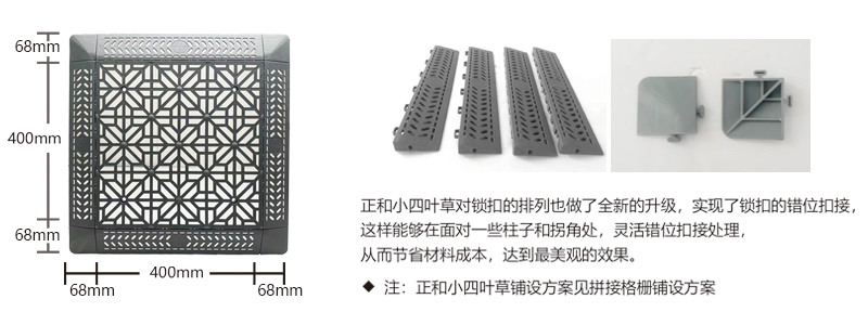 正和小四葉草采用通扣設計,可以確保產品鋪設完成后在任何區(qū)域單獨取出,極大的方便了客戶后期局部清理泥沙等,給店面的日常衛(wèi)生維護提供了很好的基礎。