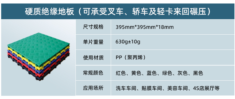 針對(duì)汽車快修車間、美容養(yǎng)護(hù)車間、汽車維修廠等區(qū)域,正和硬質(zhì)絕緣地板成為地面升級(jí)的全新選擇。正和硬質(zhì)絕緣地板下方密布數(shù)百個(gè)支撐點(diǎn),完全可以承受車輛的來回碾壓,具有安裝快速簡(jiǎn)便、對(duì)基礎(chǔ)要求寬泛、容易清理等特點(diǎn) ,特別適用于車庫地面鋪設(shè)使用,也可作為產(chǎn)品展示的臨時(shí)展臺(tái)使用。 正和硬質(zhì)絕緣地板采用100%純新PP材料生產(chǎn)而成,無毒、無味、環(huán)保,可回收利用,也可以用于健身房、辦公室等商用領(lǐng)域地面使用。