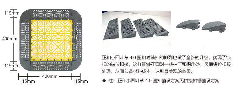 正和小四葉草4.0圓扣采用通扣設(shè)計(jì),可以確保產(chǎn)品鋪設(shè)完成后在任何區(qū)域單獨(dú)取出,極大的方便了客戶(hù)后期局部清理泥沙等,給店面的日常衛(wèi)生維護(hù)提供了很好的基礎(chǔ)。